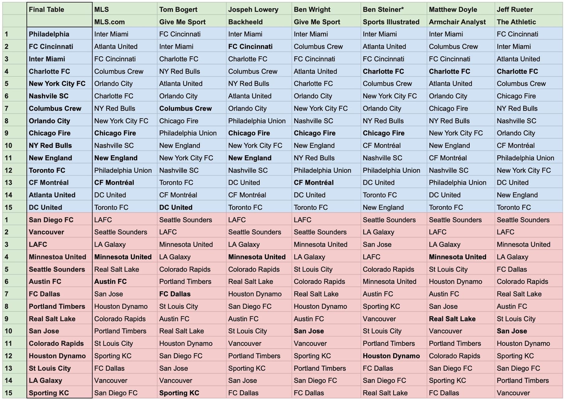 The biggest whiffs by the punditry were almost all the same: Atlanta and Philadelphia in the East, LA Galaxy and San Diego in the West. (Shoutout to Reuter, who broke ranks by stumbling the most with Vancouver, the second-place team which he picked to finish last in the West.) The only question was the magnitude of the miss.
