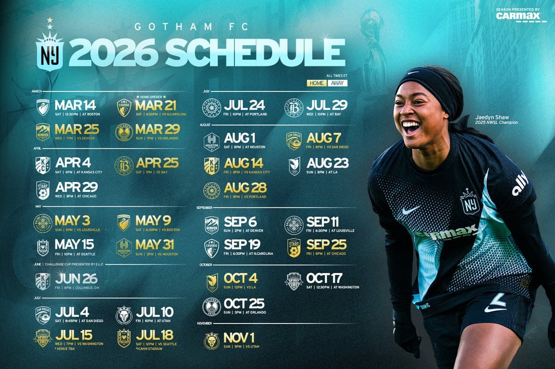 While those are the main points for Gotham's regular season, there are other competitions and disruptions to account for on the 2026 calendar. In the middle of May, Gotham will break from NWSL action to again compete for the Concacaf W Champions Cup trophy, which they won last year, though with details still TBD.