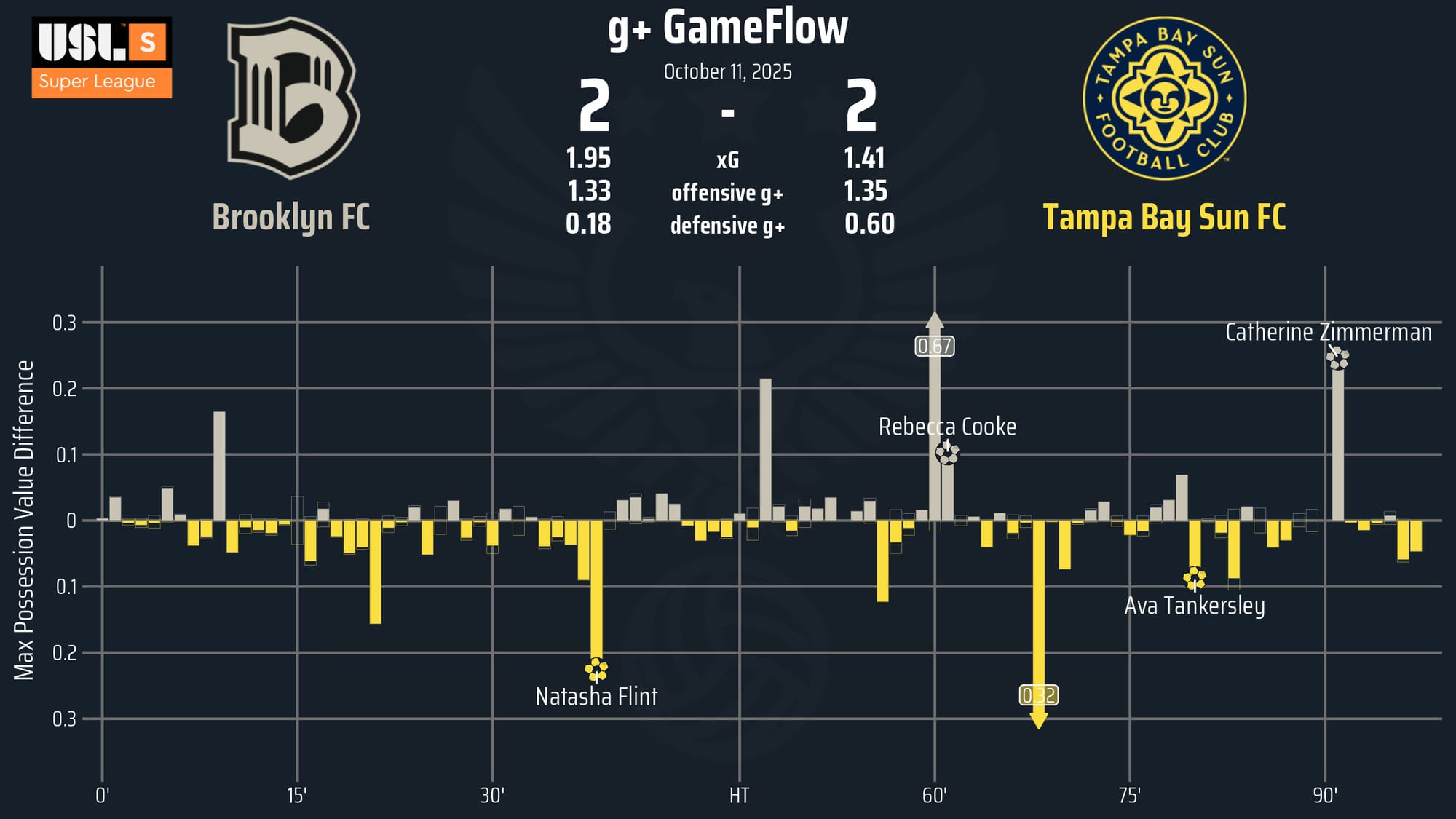 Tampa Bay opened the scoring in the 38th minute when Flint drifted into space and finished from close range. Brooklyn equalized in the 61st minute through striker Rebecca Cooke, who drove into the box and placed a low shot inside the right post. Tankersley restored the Sun’s lead in the 80th minute. But Brooklyn provided the final moment of drama in the game, when a free kick allowed Garziano to send a curling cross into the box that found Catherine Zimmerman, who headed home the equalizer.
