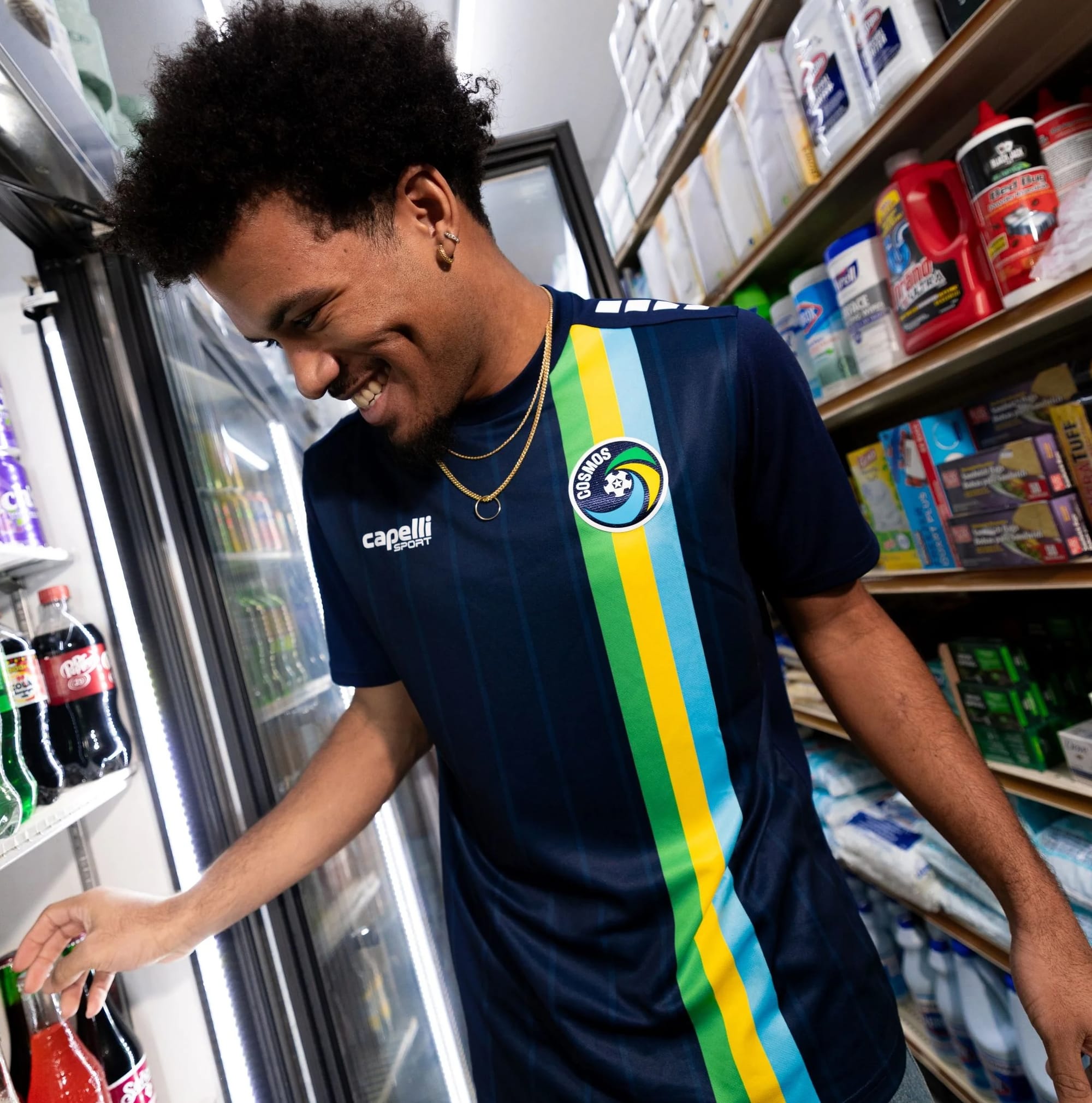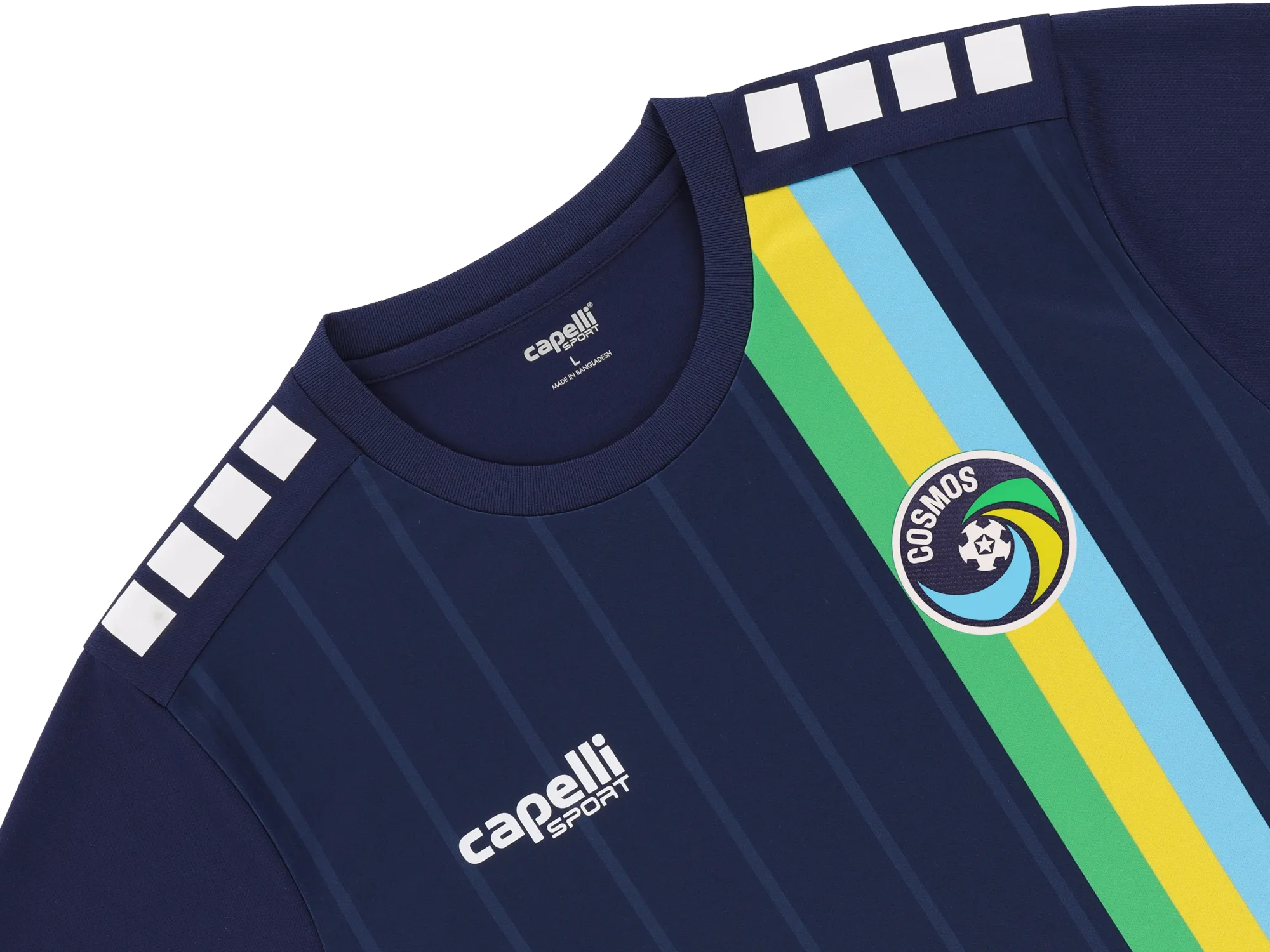 The deep navy-blue shirt is "built to be worn anywhere — at home, on the road, and everywhere in between," according to the Club. "The secondary kit reflects the idea that the Cosmos carry their identity with them, no matter the setting. From North Jersey to every city the club enters, the jersey symbolizes pride, belonging, and the shared culture that connects players and supporters."