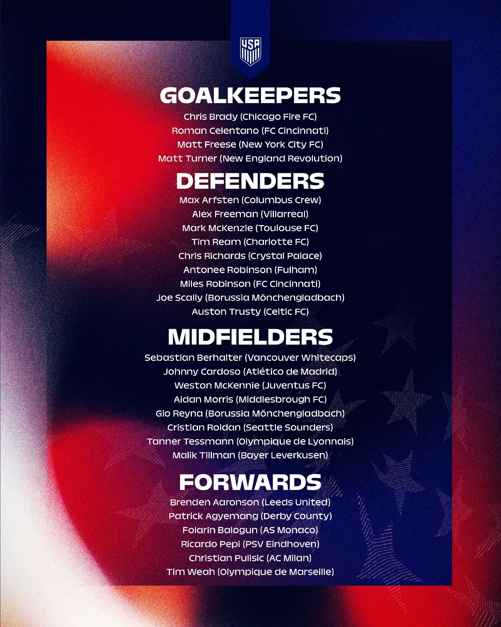 Matt Freese received another call-up from the United States men's national team, as the New York City FC goalkeeper is in the 27-player squad named by Mauricio Pochettino for the team's upcoming pre-FIFA World Cup friendlies against Belgium and Portugal to be played in Atlanta, Georgia.