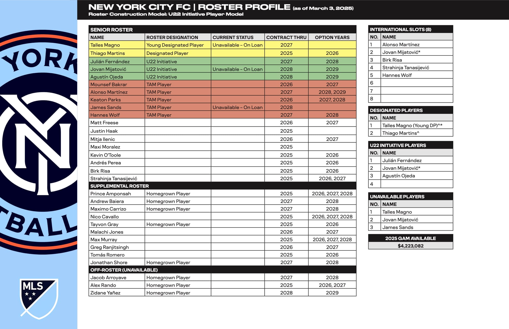 This year, they’ve again chosen the U22 Initiative roster construction model, so New York City have two unfilled U22 Initiative slots and one unfilled Designated Player slot. That's because Talles Magno and Jovan Mijatović are both out on loan, freeing up their respective DP and U22 slots.