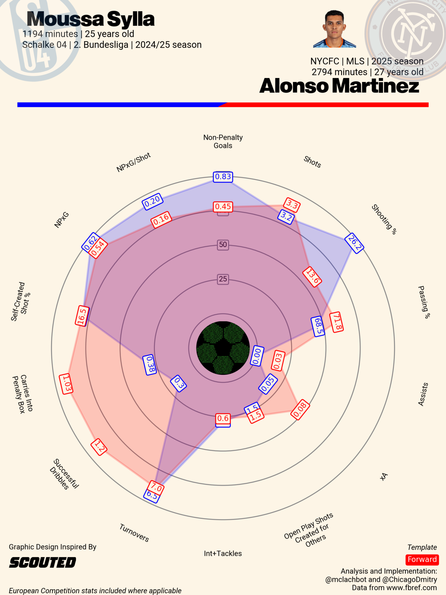 To look at their most recent full seasons side-by-side, Martínez's 2025 in MLS and Sylla's 2024-25 in the 2.Bundesliga, you'll see similar attacking profiles, though with Martínez much more of a threat off the dribble than Sylla.