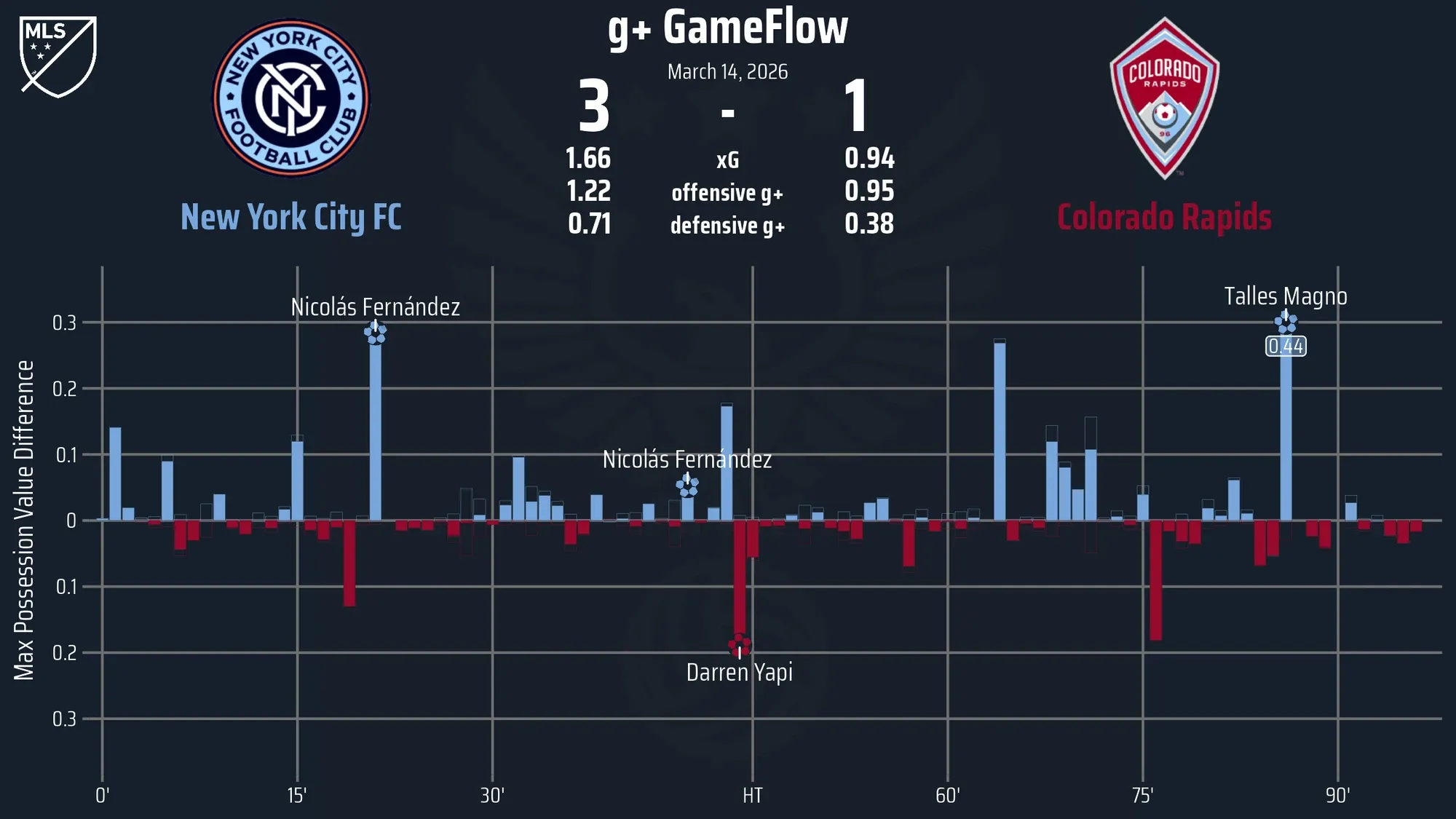New York City FC continued their strong start to the season with a third consecutive win, defeating Colorado Rapids 3-1 under the lights at Yankee Stadium. Two first-half goals from Nico Fernández Mercau gave the Pigeons all three points, while Talles Magno put the icing on the cake late in the second half with his first goal since returning to the club in the offseason.