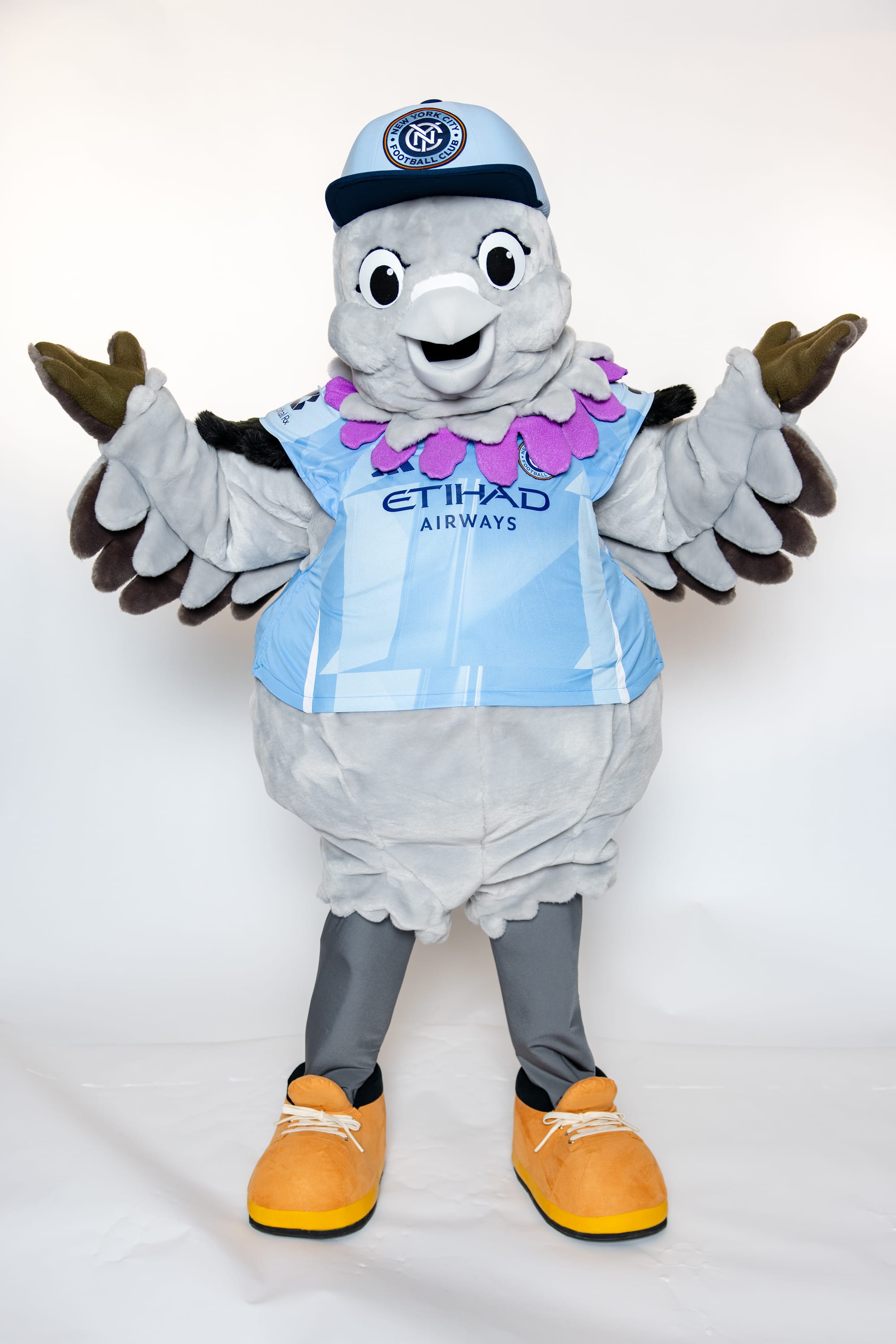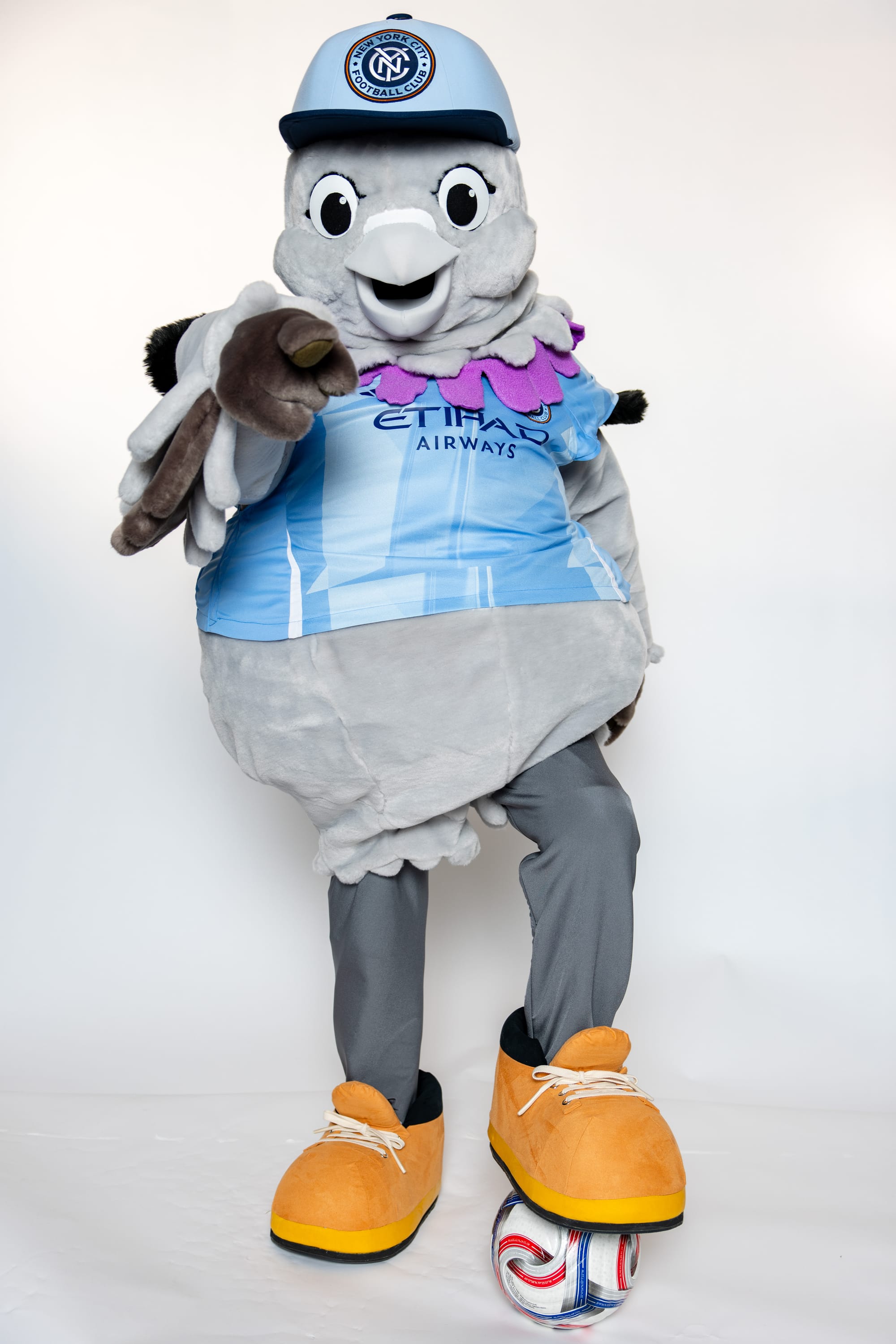 As with rock doves found across New York City, Sky’s plumage features various shades of gray and an iridescent ring of purple feathers beneath their neck, fittingly the color of the 7 train - the route to the Club’s future home at Etihad Park. Sky often sports a New York City FC baseball cap, sturdy work boots favored by New Yorkers, and a star-shaped birthmark near their belly button which Sky first noticed shortly after the Club’s 2021 MLS Cup victory.