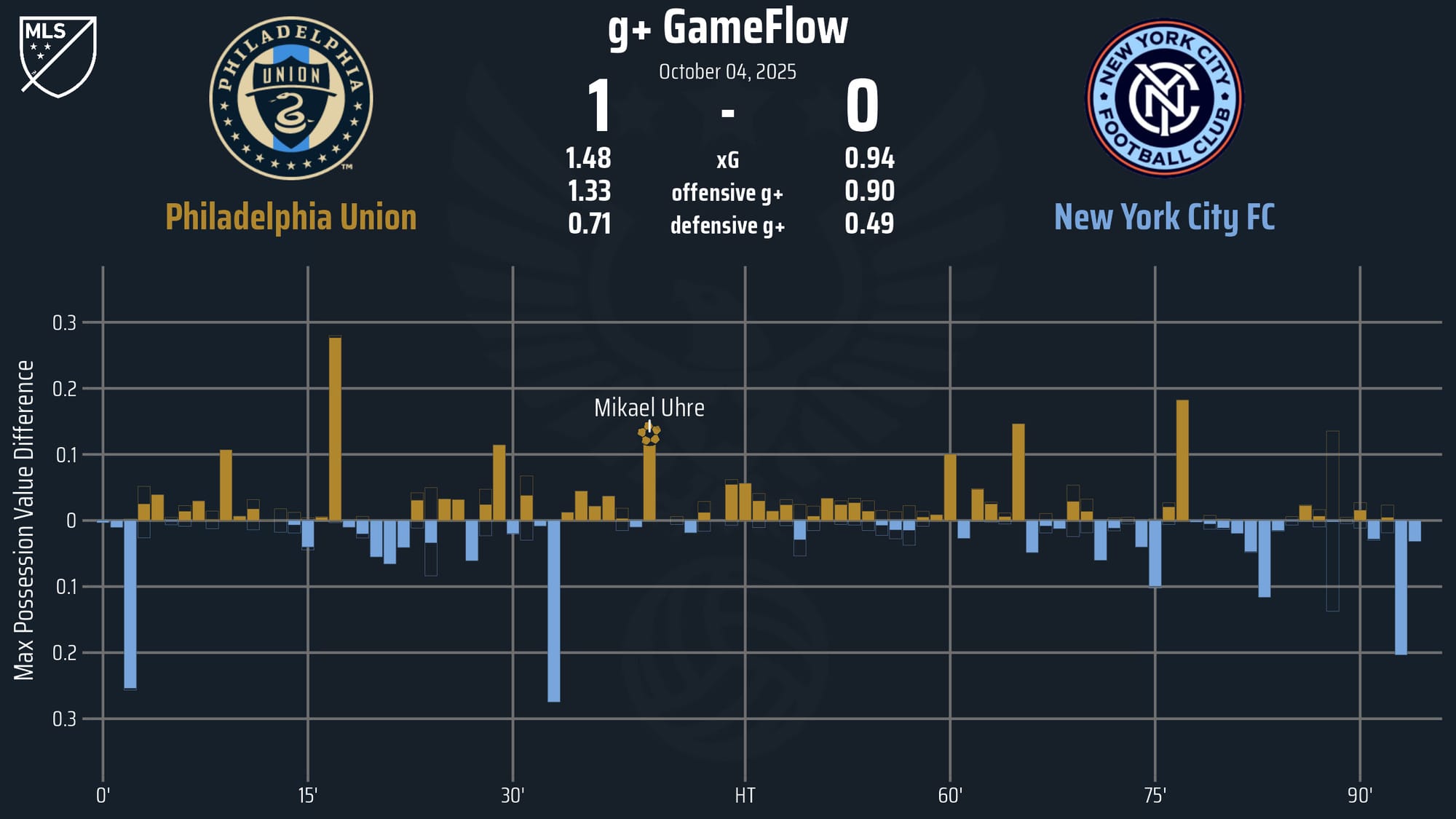 NYCFC's punishment for not converting either of those opportunities arrived in the form of Mikael Uhre's goal in the 40th minute, from a strike that deflected off Raul Gustavo and sent Matt Freese the wrong way. Philadelphia, unlike New York City, capitalized on a chance available to them on the counterattack, and then made that one-goal lead stand up for the next 50 minutes.