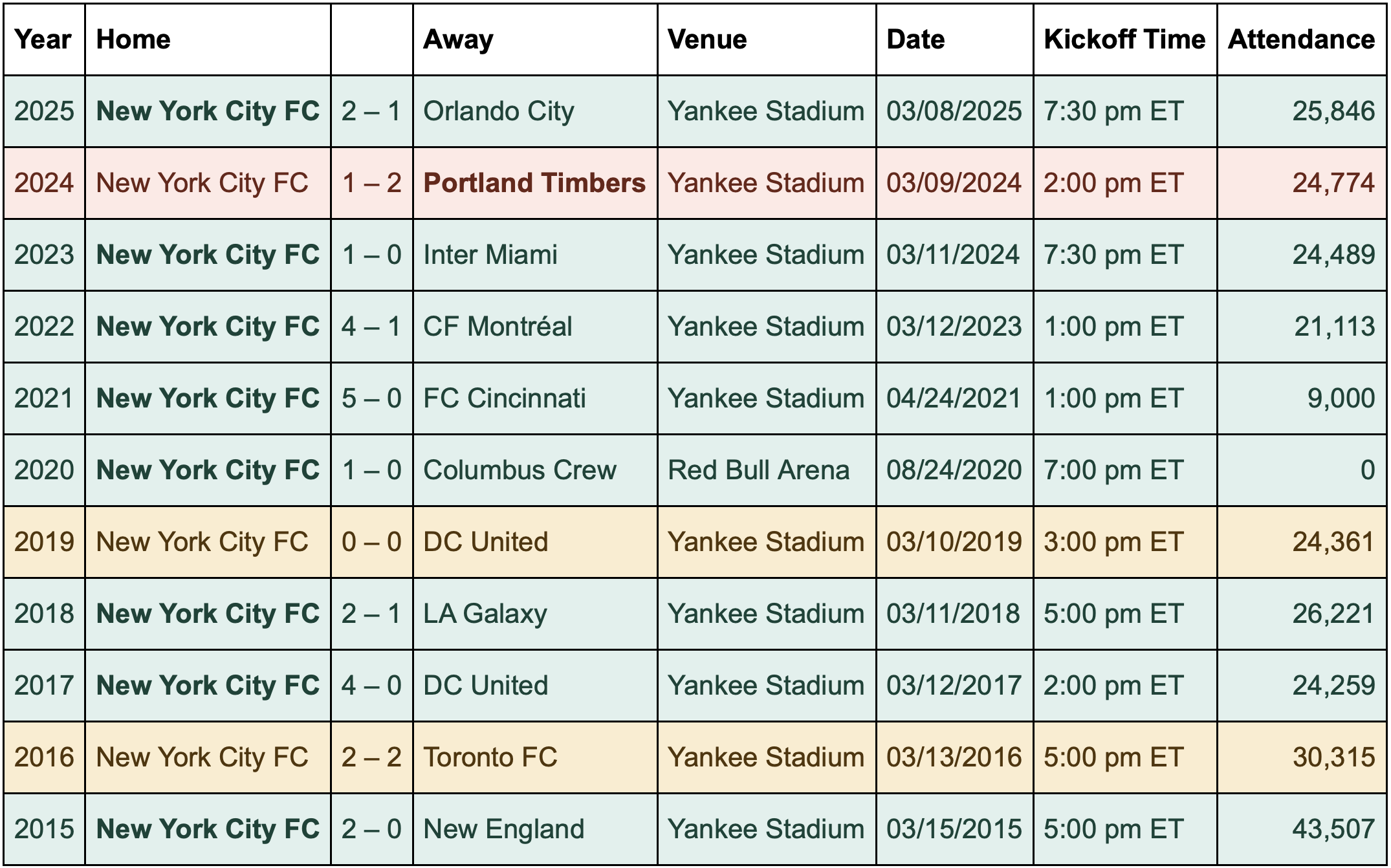 The club's lone loss came in 2024, when a 97th-minute goal from Evander delivered a 2-1 win to Portland Timbers at Yankee Stadium. But even then, the Pigeons have only dropped seven points out of a possible 33 in home openers, while scoring 23 goals and conceding just six.