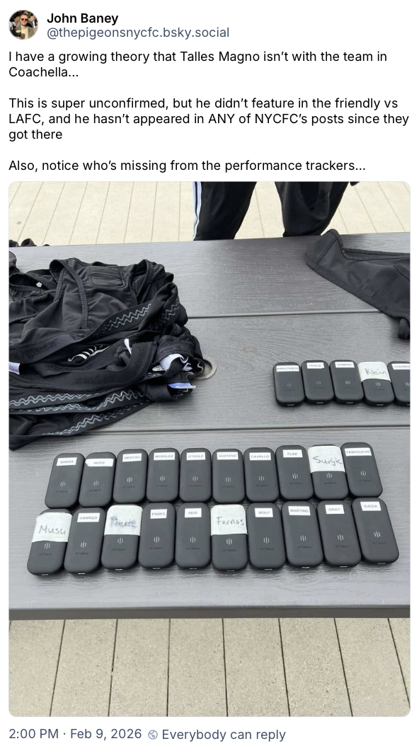 But the 23-year-old didn't appear in the club's 1-1 draw with LAFC yesterday at the 2026 Coachella Valley Invitational despite the team's desperate need of a striker. And then sharp-eyed Hudson River Blue contributor John Baney noted that there was no "Talles" among the club's player trackers in New York City's most recent batch of training photos.